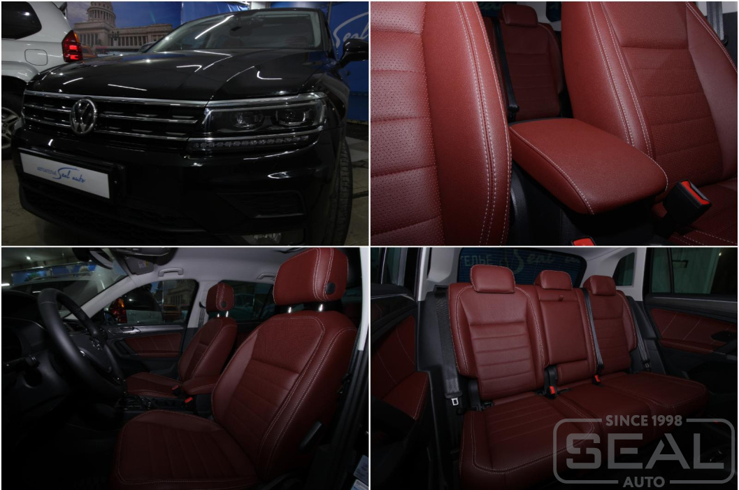 А это уже Тигуан второго поколения. В перешиве салона данного авто мы использовали автомобильную экокожу коллекции Dakota бордово-коричневого цвета