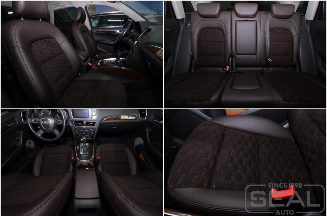 Перетяжка сидений Ауди Q5, клиент приехал на черной заводской коже, а уехал на автомобильной экокоже Dakota шоколадного цвета с вставками из оригинальной Алькантары. Ну и конечно строчка "сотами" украсила эти сидения