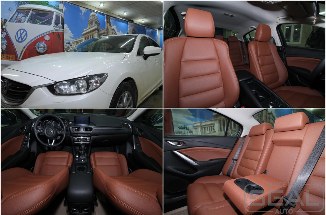 Пошив кожаного салона для Мазда 6 последнего поколения. Для белого цвета кузова выбранный цвет кожи стильно вписался в обновленный интерьер салона и придал некую индивидуалность автомобилю
