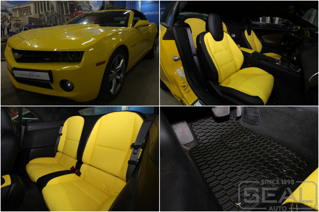 Шевроле Камаро - классика жанра! Яркий американец приехал к нам с классическими черными сидениями, а уж мы постарались добавить пестрых красок в интерьер этого монстра, вдобавок сшили ему коврики из экокожи с ярко-желтой строчкой.
