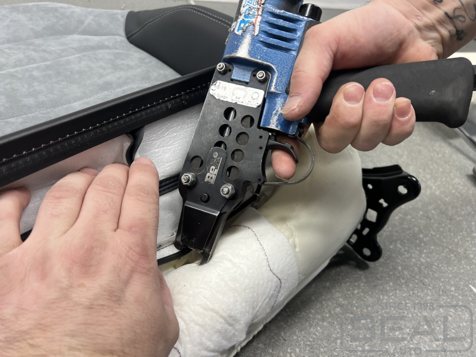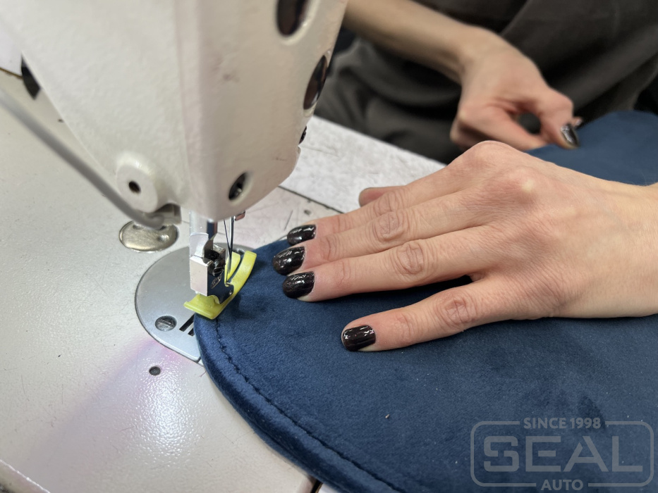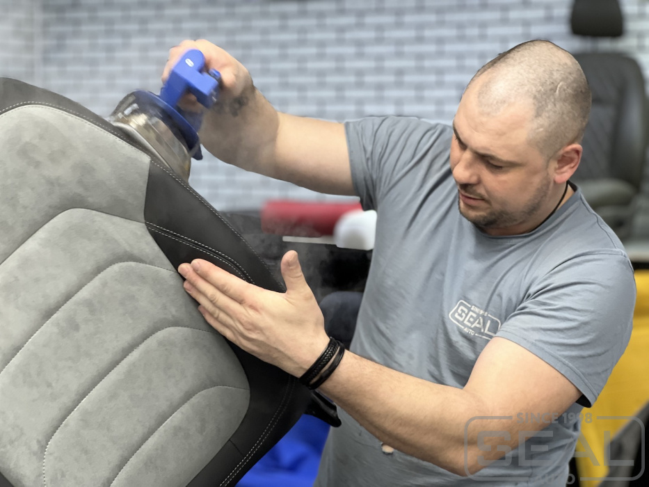 Этап по обработке парогенератором новой обивки переднего кресла.