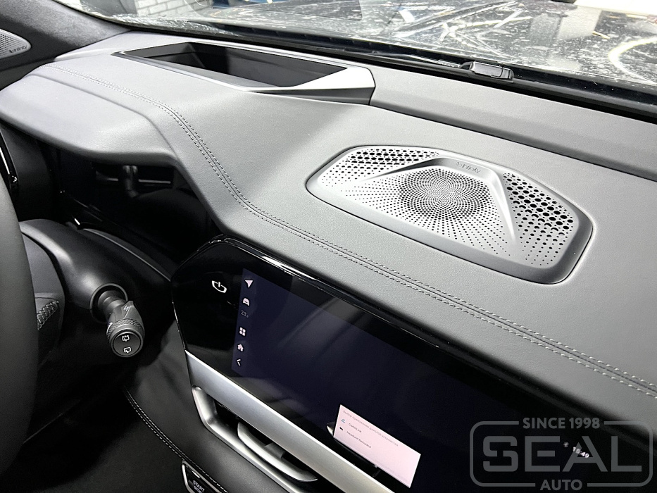 Это салон Range Rover Velar в интерьере которого мы перешили центральную часть торпедо и клаксон.