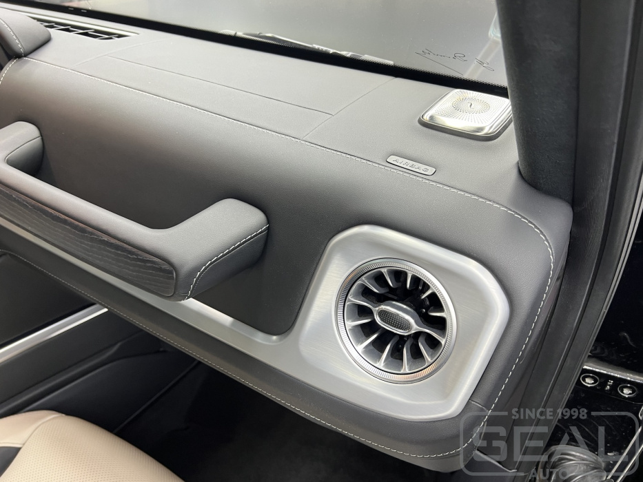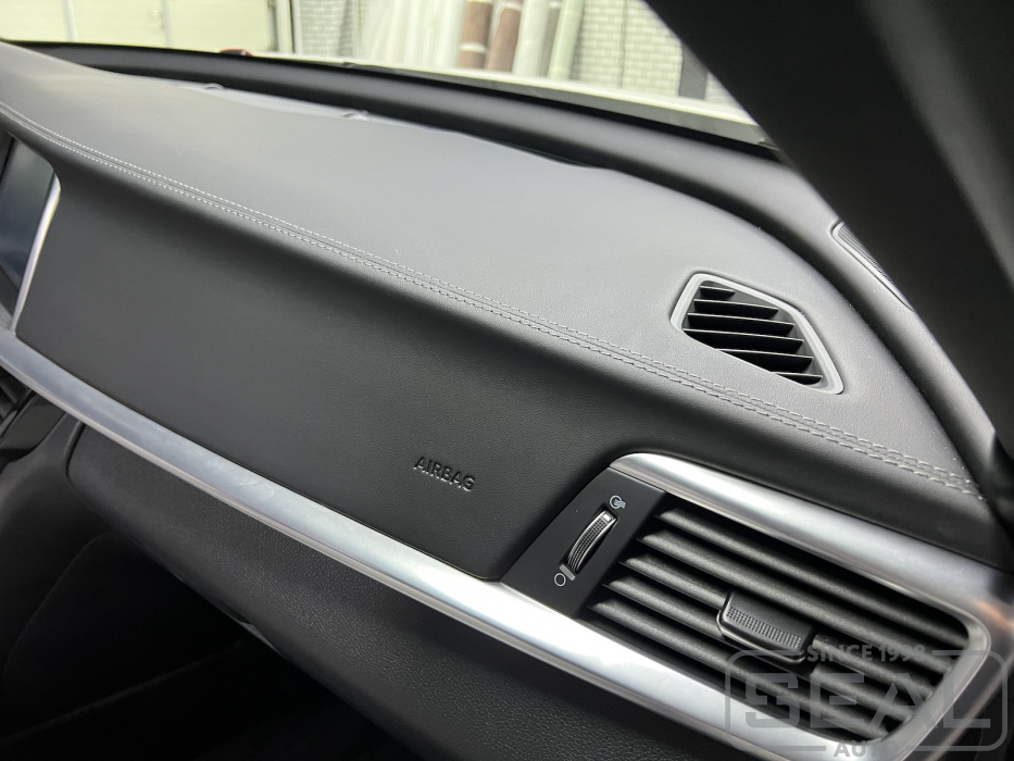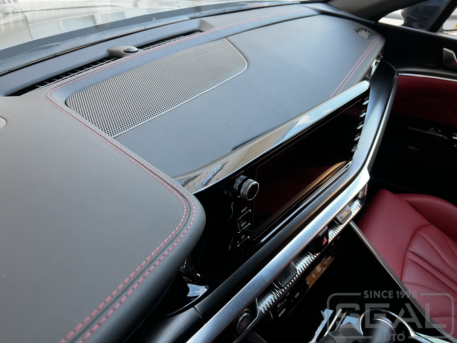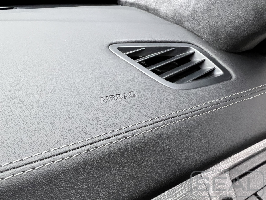 Четкие линии и сочетание цветовой гаммы отделочной нити и Алькантары на стойках делает интерьер салона единым целым.