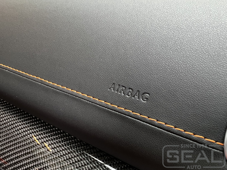 Отличное сочетание черной кожи Nappa с оранжевой нитью и карбона на приборной панели.