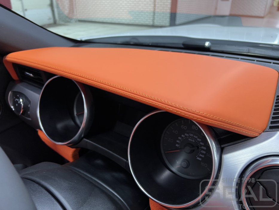 Перетяжка козырька торпедо автомобиля Форд Мустанг. В салоне этого авто мы перешили почти всё!