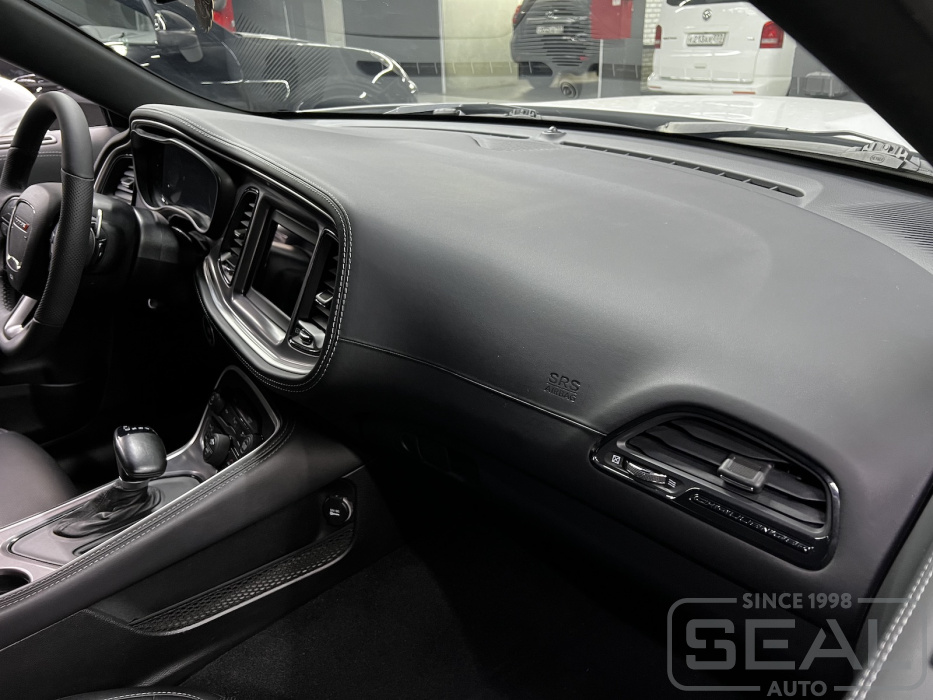 Верхняя часть торпедо после перетяжки автомобильной эко кожей. Автомобиль Dodge Challenger.