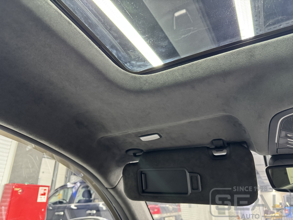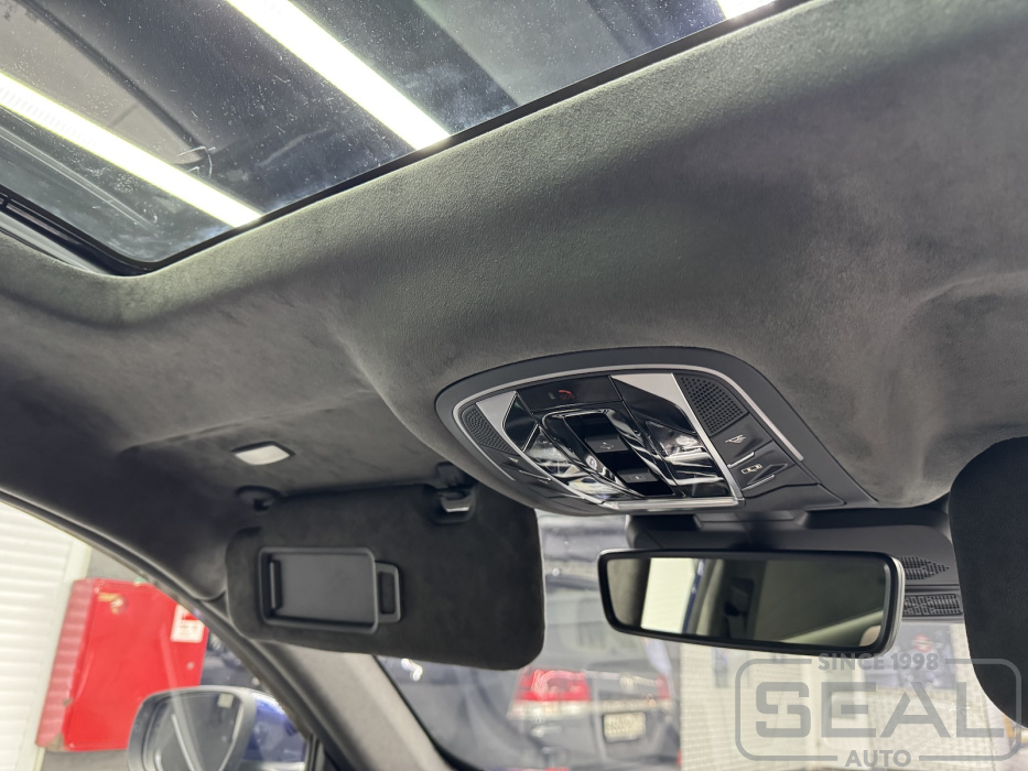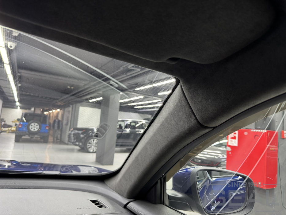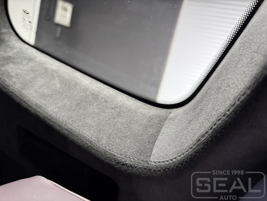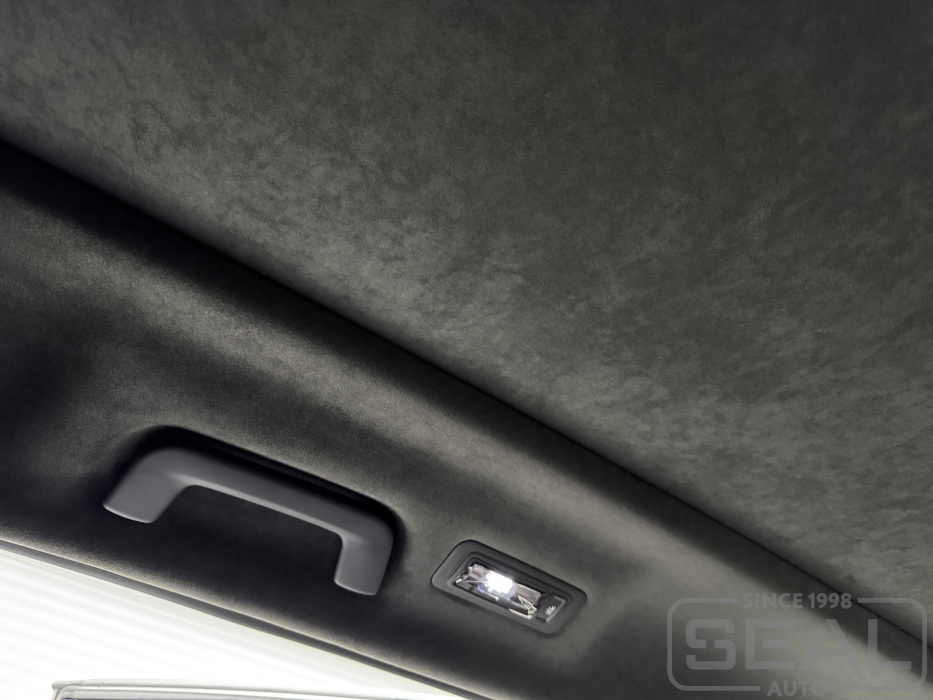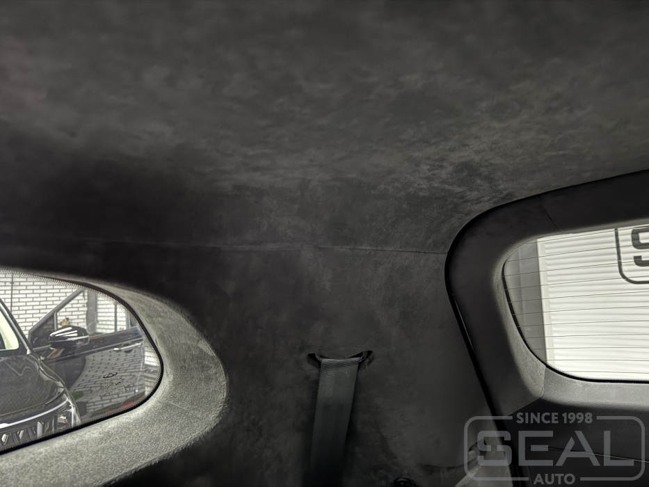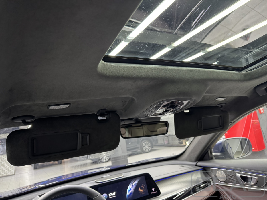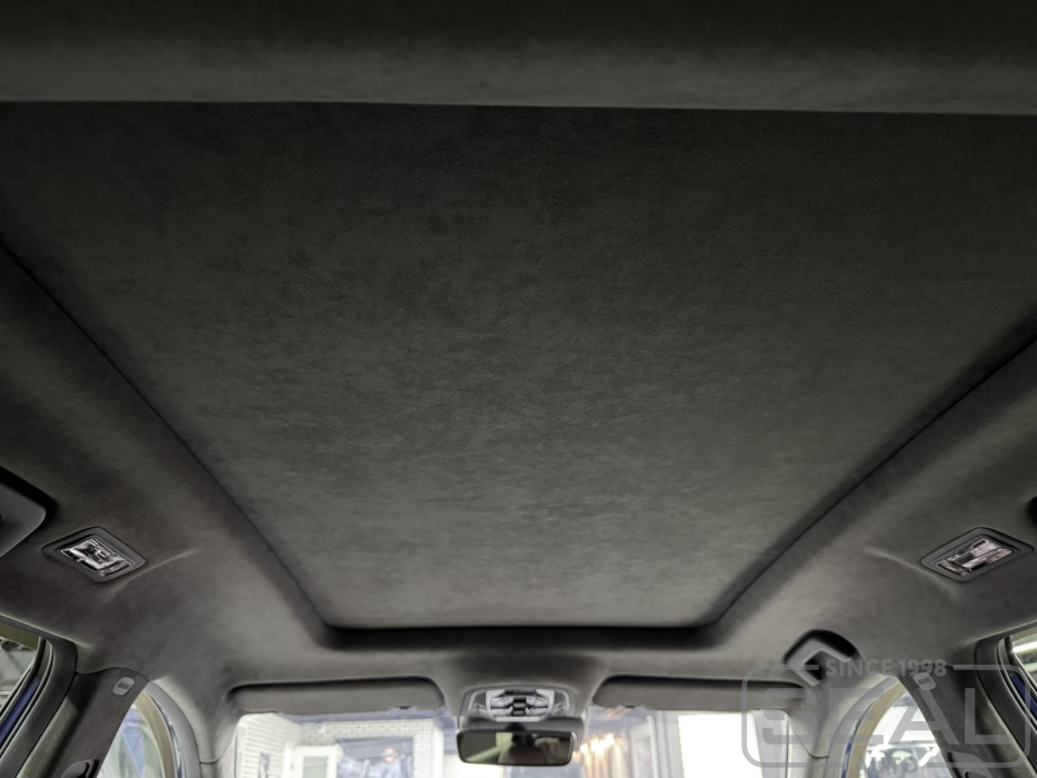 Перетяжка потолка, стоек и козырьков и шторки панарамной крыши - 145.000 рублей.
