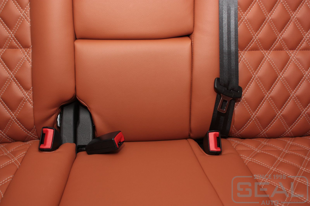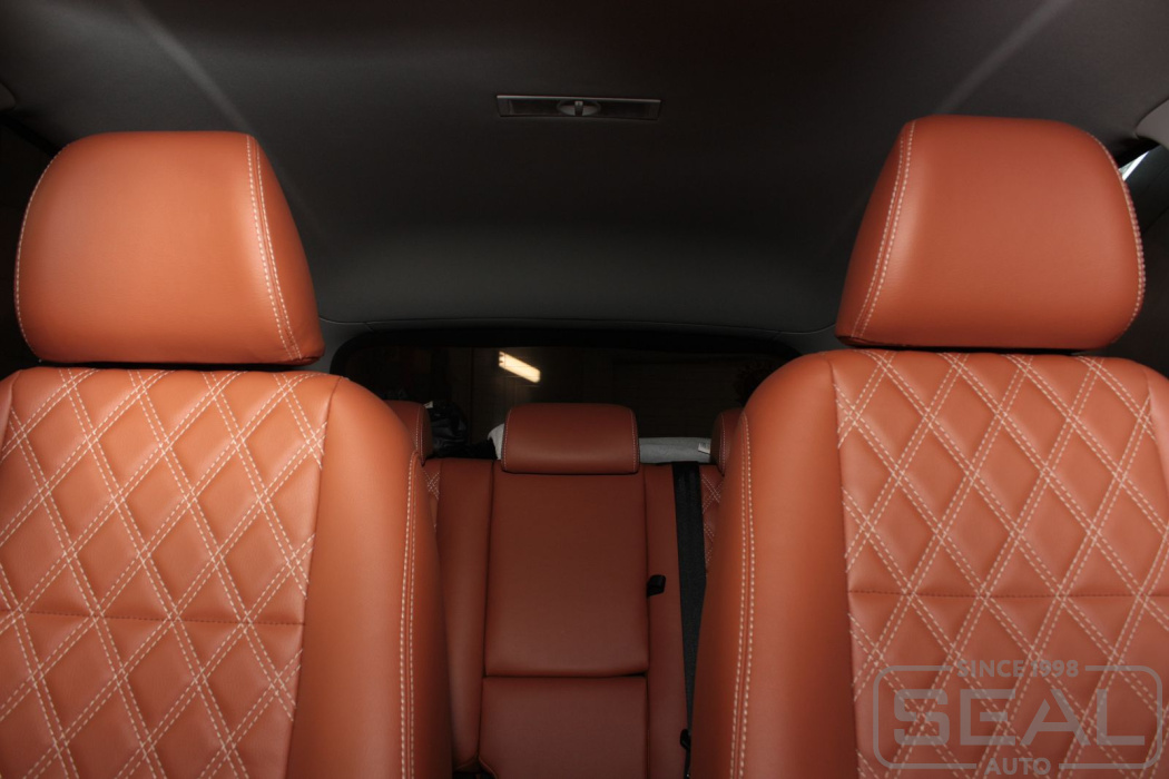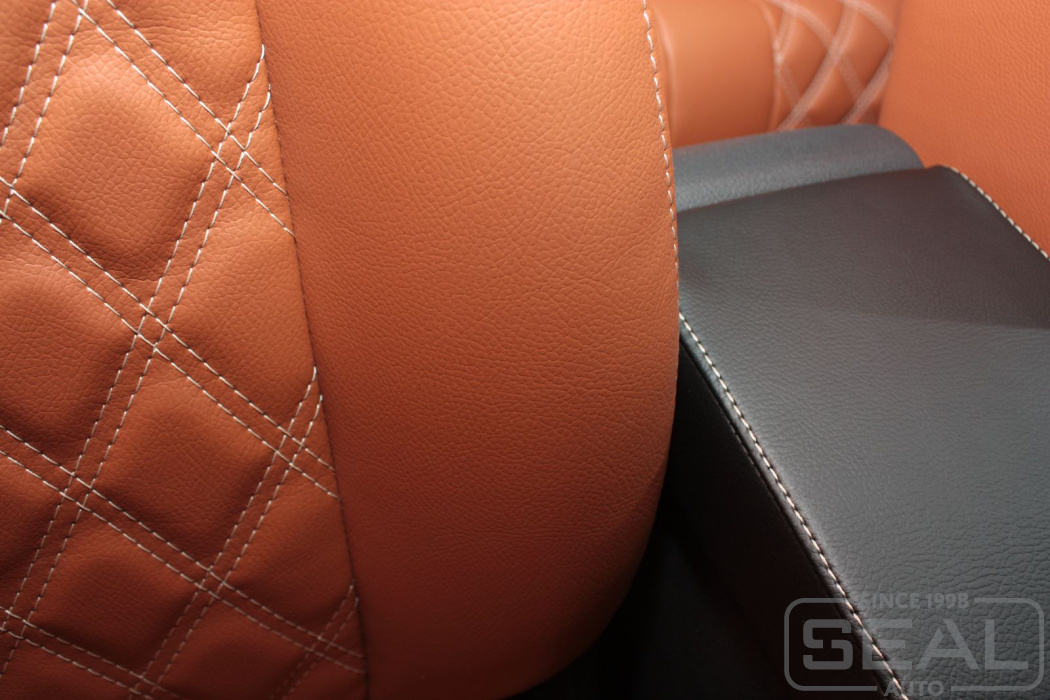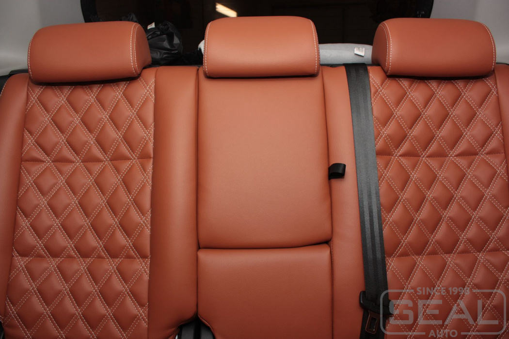 Перетяжка кожей сидений, всех подголовников и переднего подлокотника - 82.000 рублей.