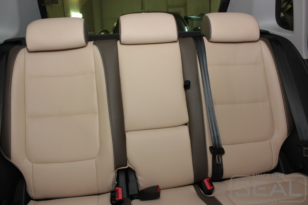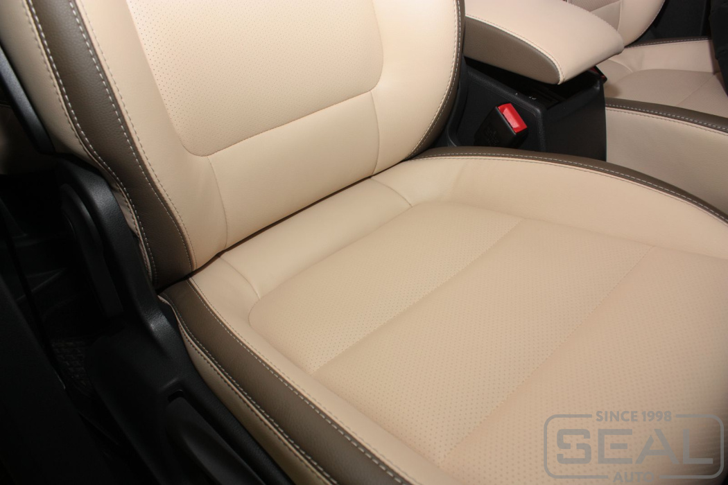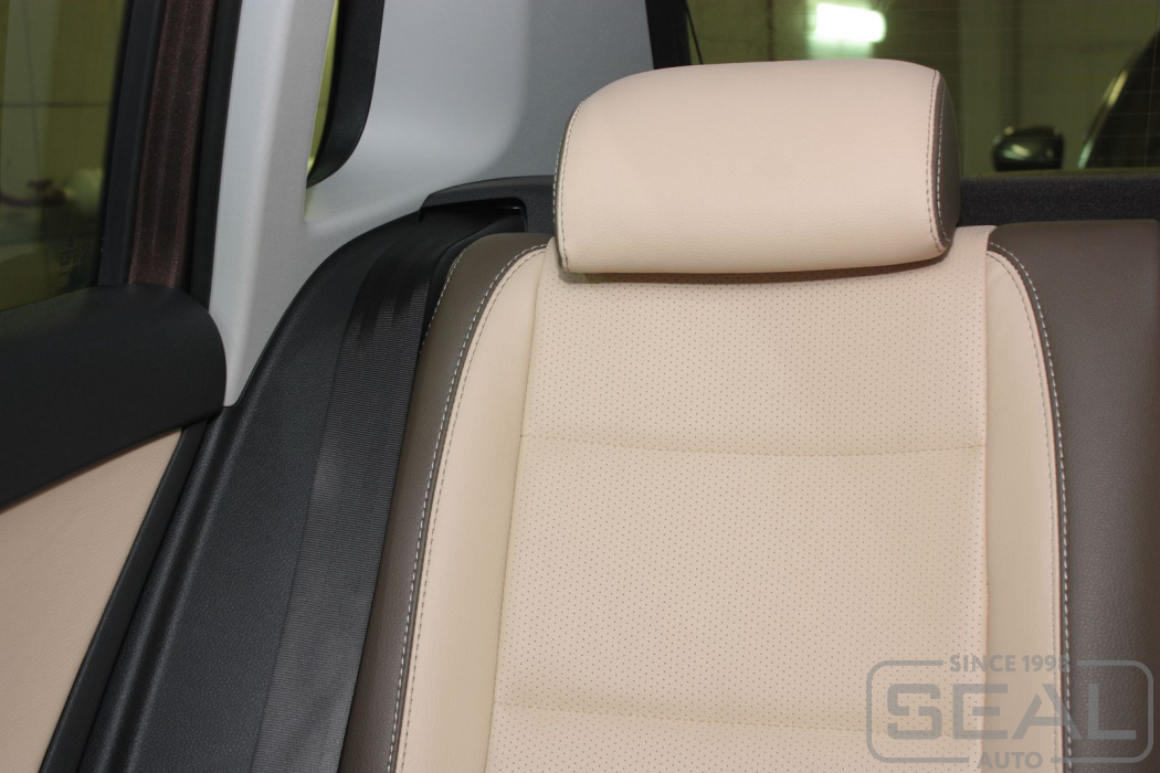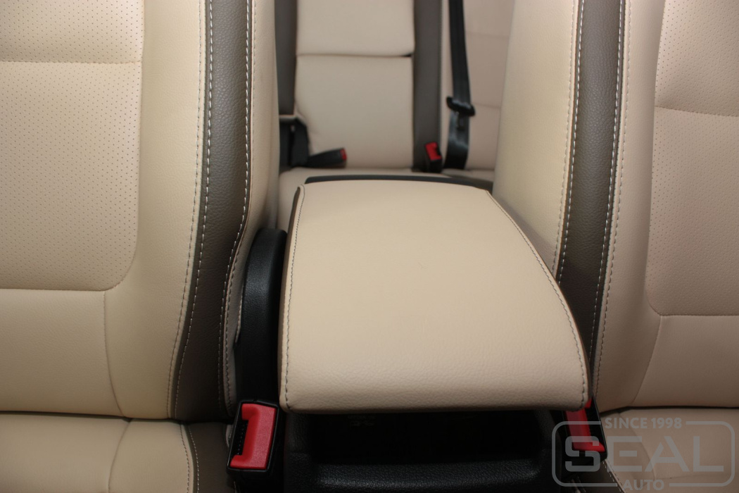 Перетяжка кожей сидений, всех подголовников и переднего подлокотника - 82.000 рублей.