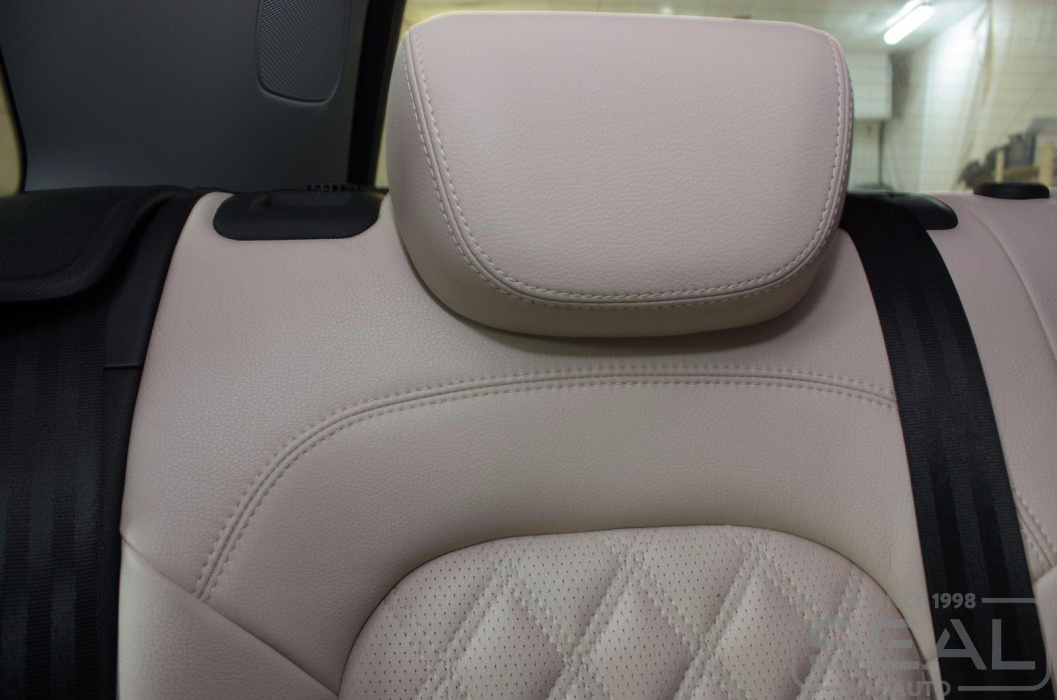 Обивка кожей сидений, подголовников (5 штук), перетяжка подлокотника - 82.000 рублей.