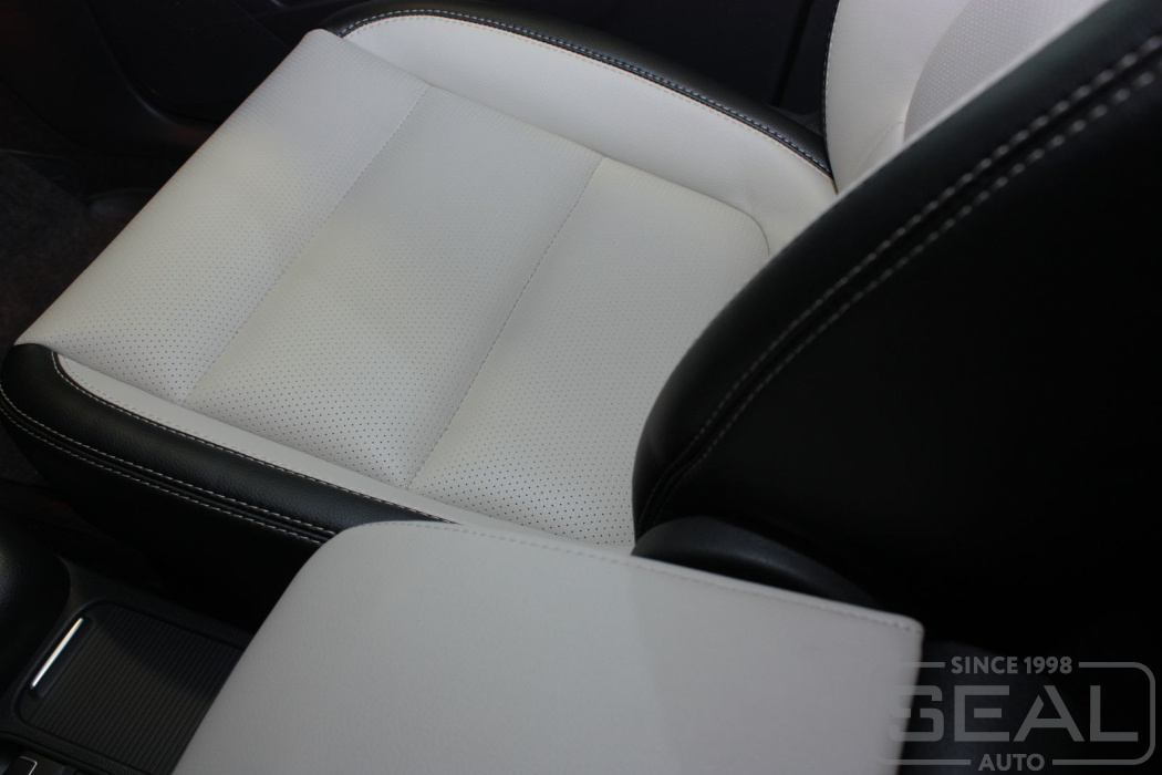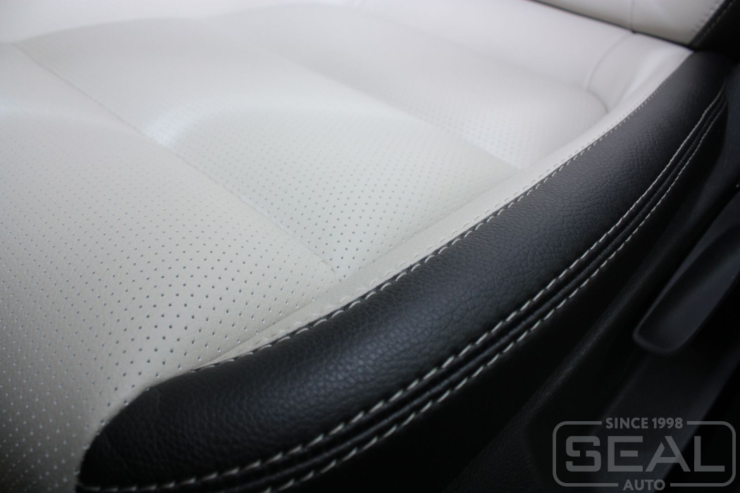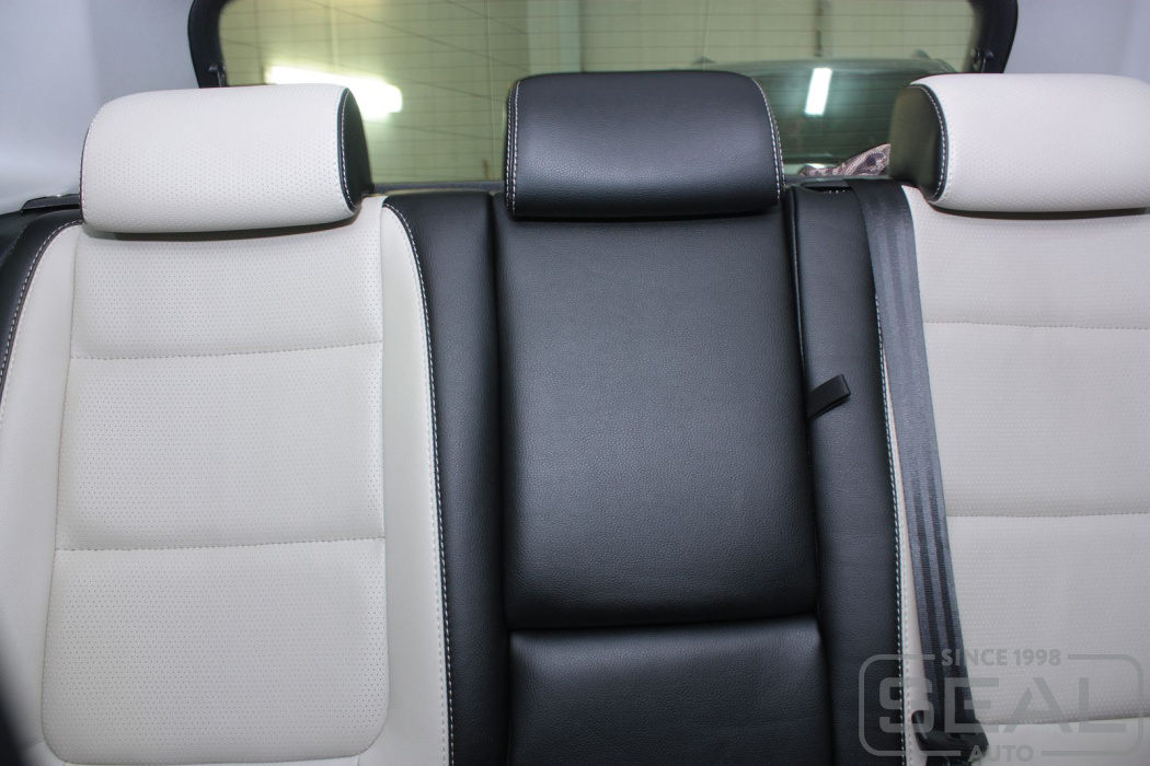 Перетяжка кожей сидений, всех подголовников и переднего подлокотника - 82.000 рублей.