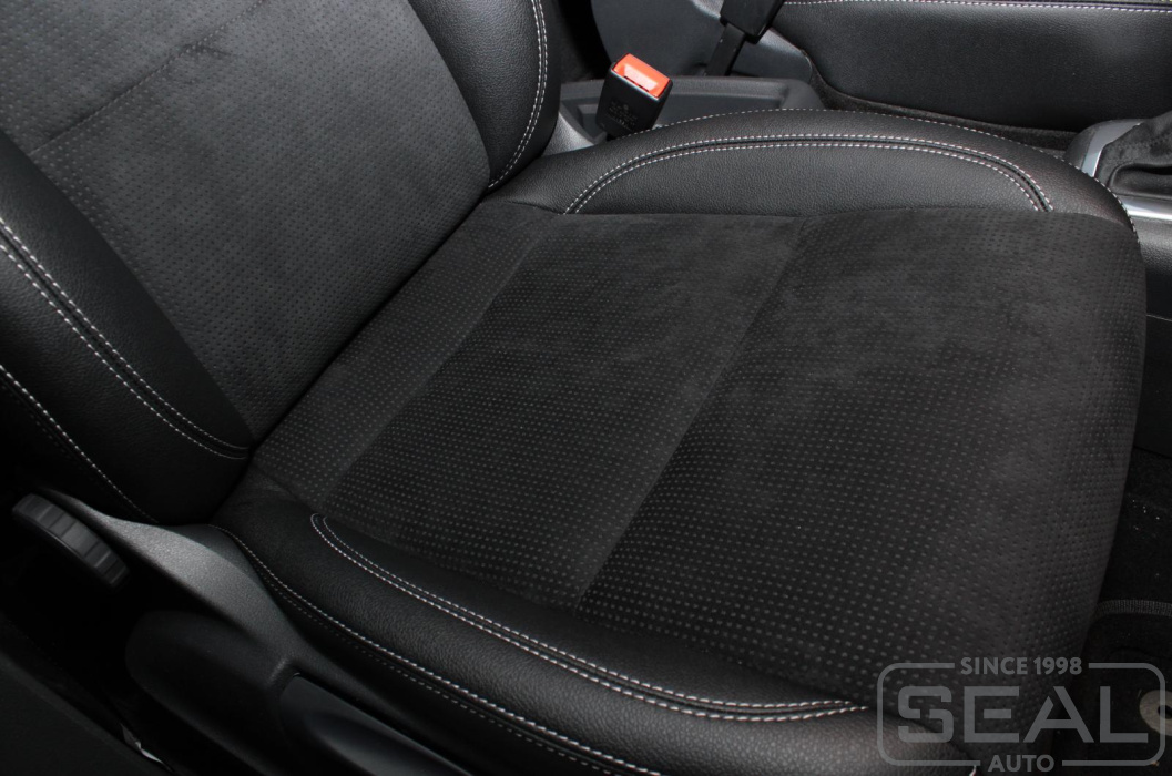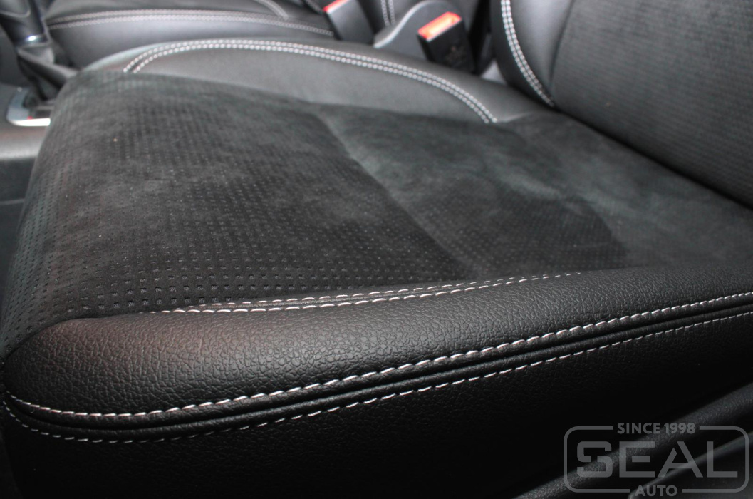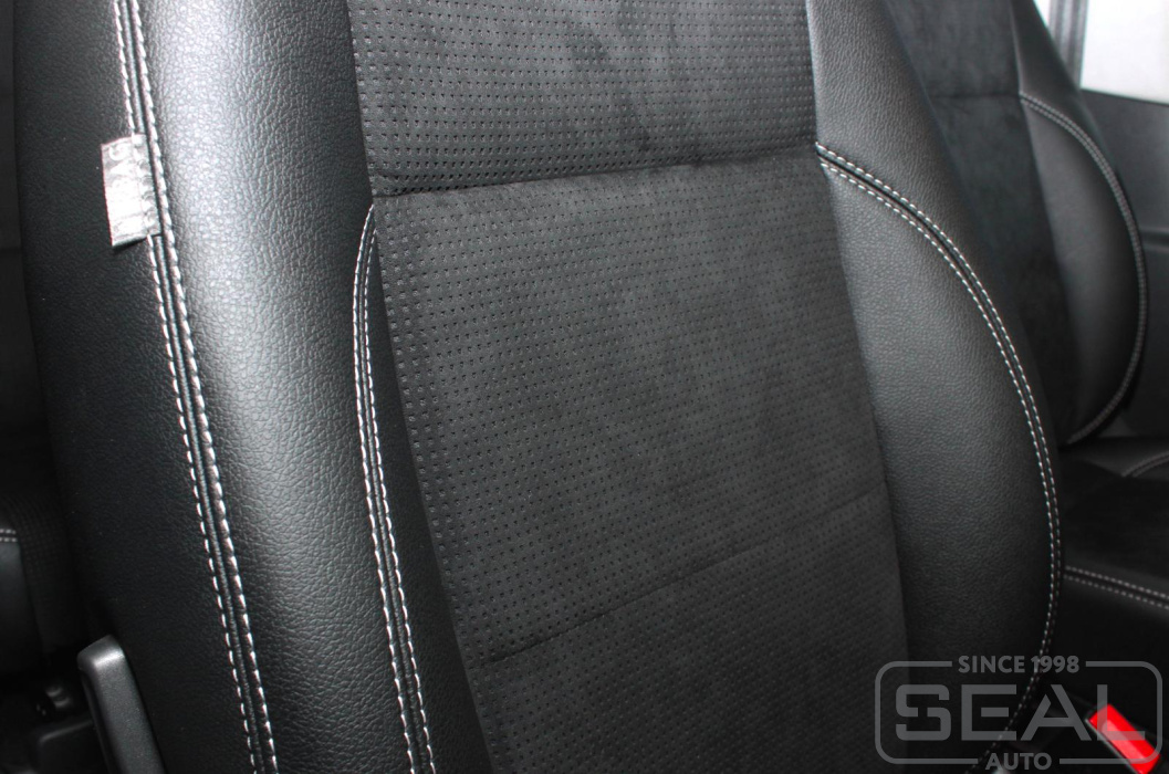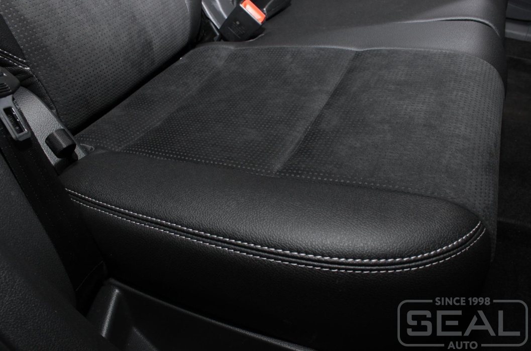 Перетяжка кожей сидений, всех подголовников и переднего подлокотника - 82.000 рублей.