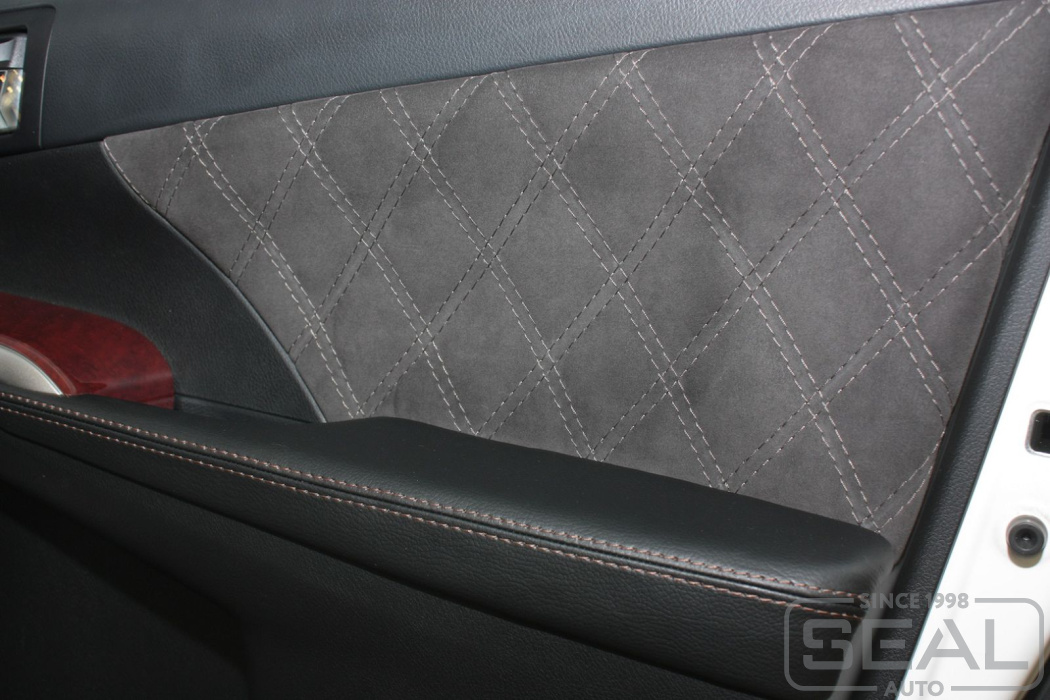 Перетяжка дверных вставок и подлокотников дверей со швом - 42.000 рублей.