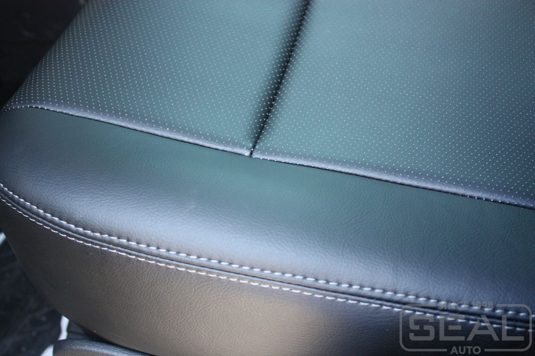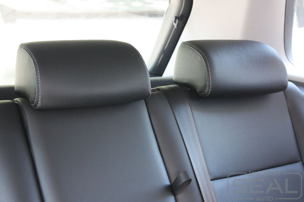 Перетяжка кожей сидений, всех подголовников и переднего подлокотника - 82.000 рублей.