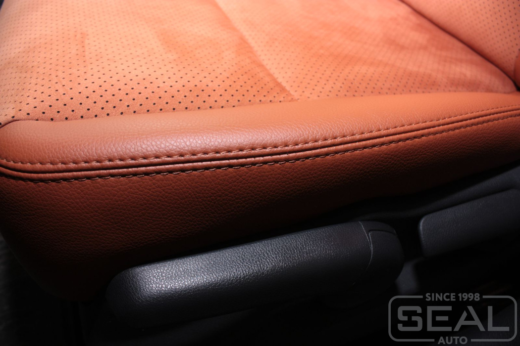 Перетяжка кожей сидений, подголовников, переднего подлокотника - 84.000 рублей.