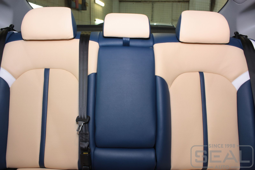 Перетяжка кожей сидений, подголовников, переднего и заднего подлокотников - 83.000 рублей.