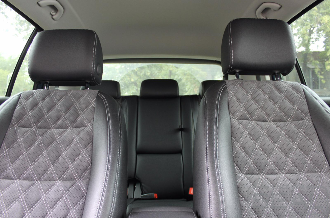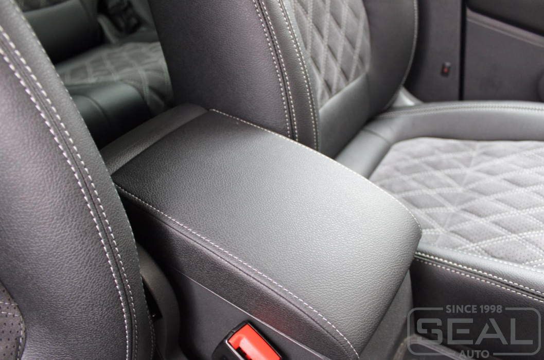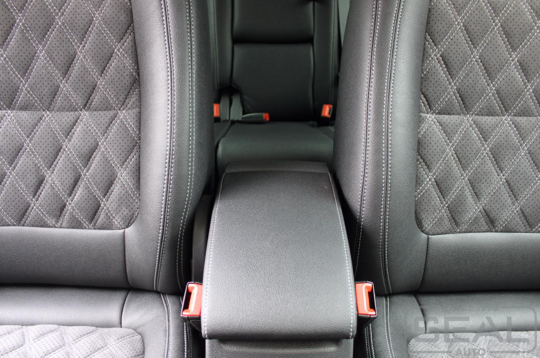 Перетяжка кожей сидений, всех подголовников и переднего подлокотника - 82.000 рублей.