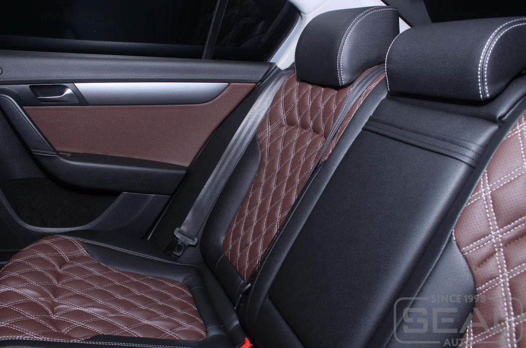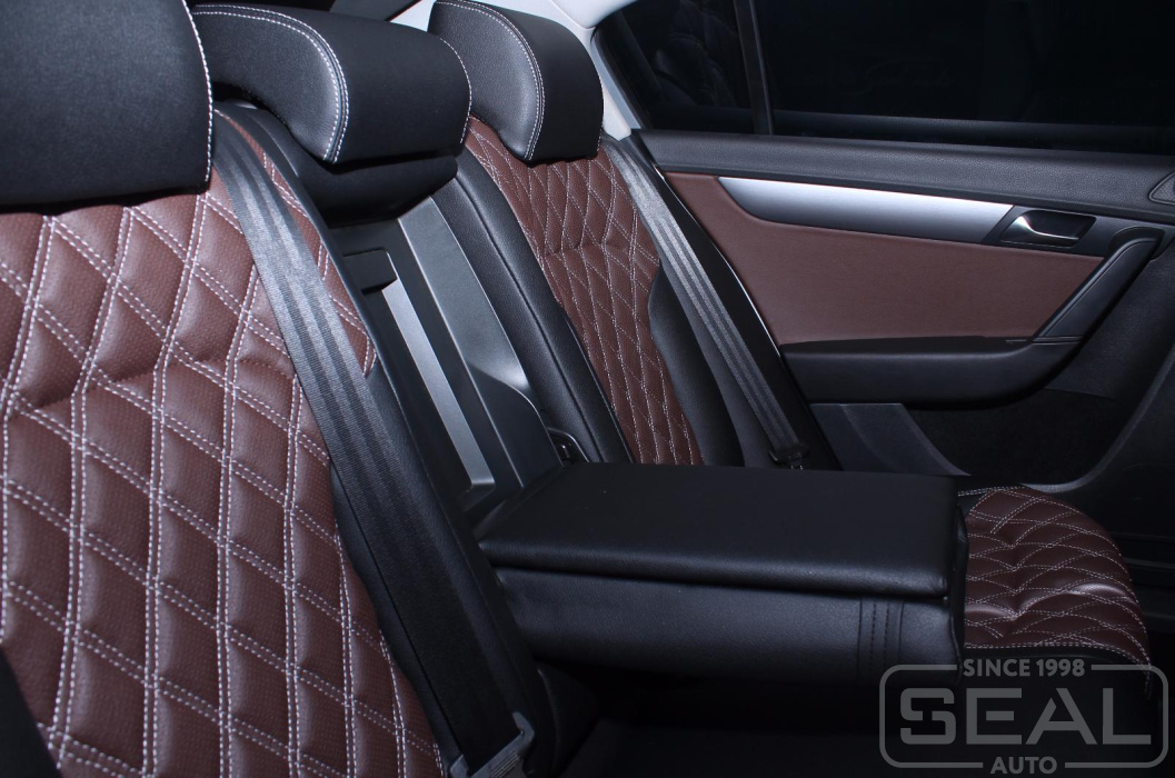 Перетяжка кожей сидений, всех подголовников и переднего подлокотника - 82.000 рублей.