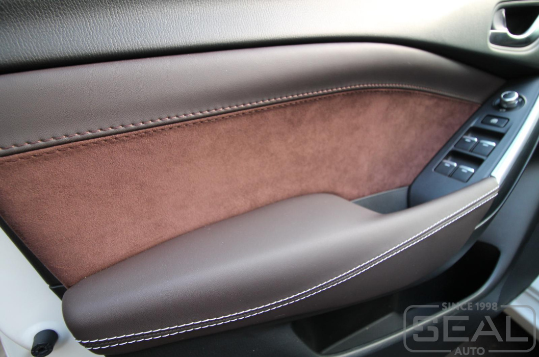 Перетяжка дверных карт со швом и подлокотников (комплект) - 44.000 рублей.