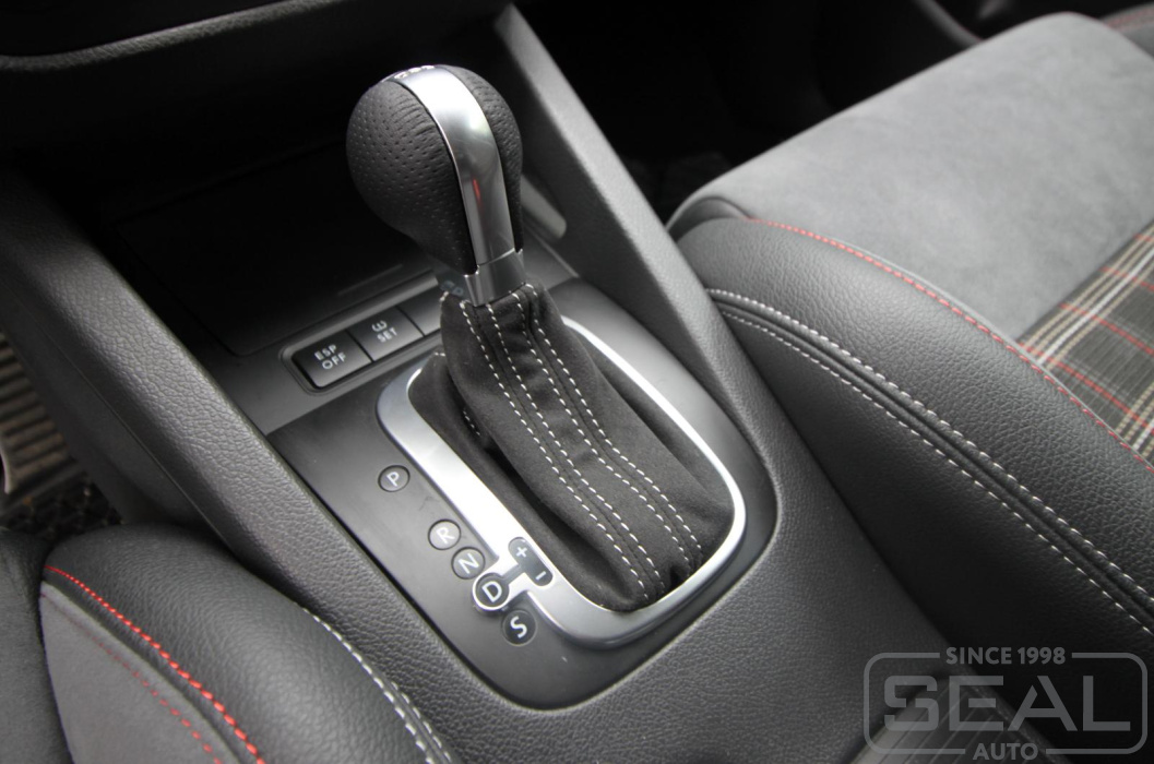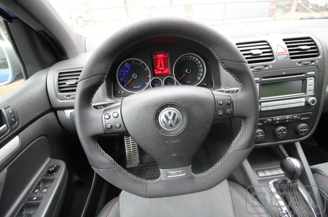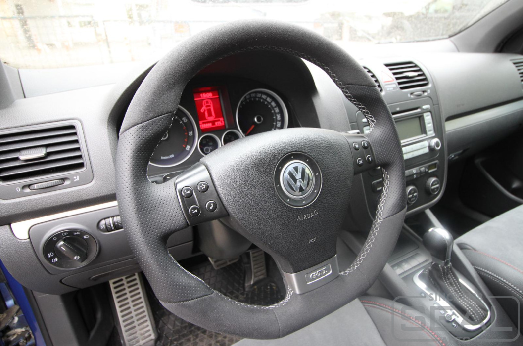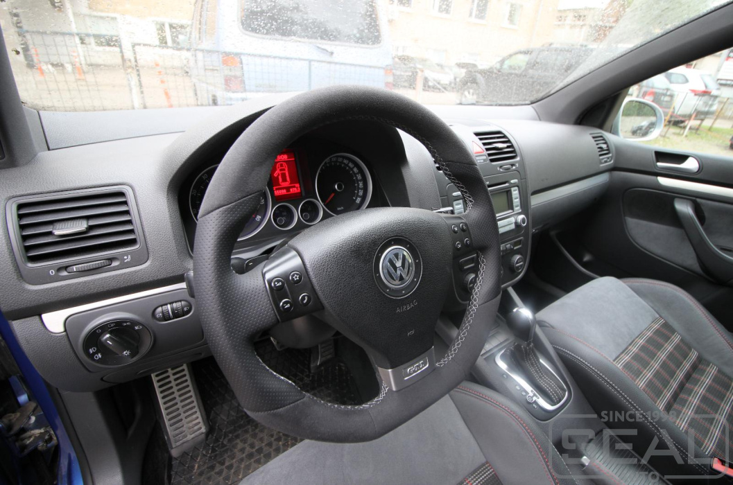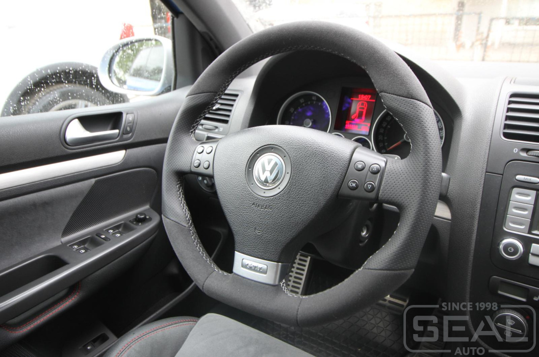 Услуга по перетяжке руля и пошиву чехла для ручки кпп на автомобиль Фольксваген Гольф GTI.
